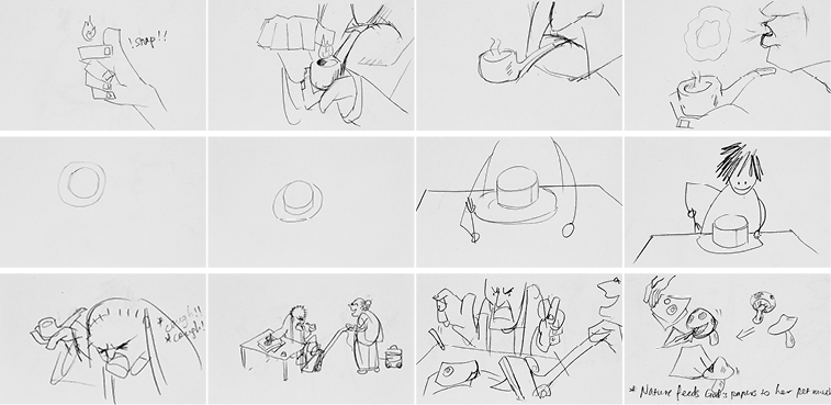 An important theme of the film is the paradoxical coexistence of symmetry and asymmetry in this world. To communicate this feature, one of the initial ideas was to personify the force for organization and force for chaos as a pair of old married couple. I tend to think of the idea of God to carry more association with intelligent design, and the idea of Nature to be wild and unreasonable. But because everyone has different interpretation of the meaning of “God” and “Nature”, and I do not have the luxury of time in the film to develop them as tangible characters, they were eventually cut from the story.
